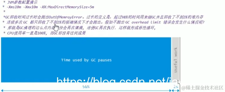- OutOfMemoryError: GC overhead limit exceeded 超过98%的时间用来做GC并且回收了不到2%的堆内存