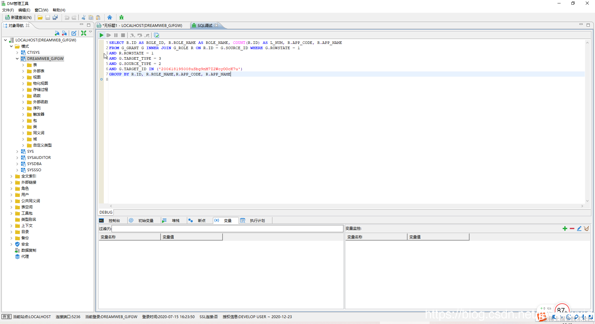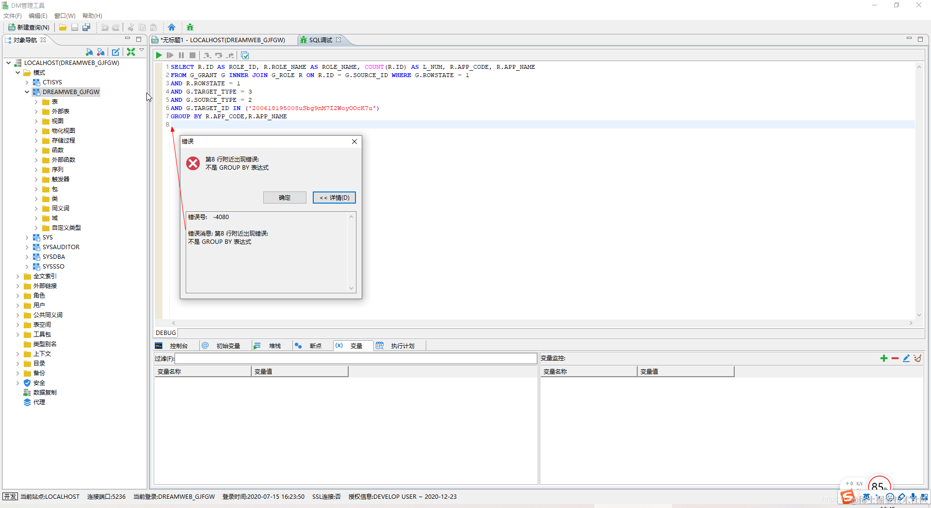 达梦数据库,第二章:报错不是 GROUP BY 表达式 我是廖志伟 2021-04-28 530 阅读1分钟 达梦数据库:在select中存在的字段,必须包含在group by 语句中 sql改造: GROUP BY R.APP_CODE,R.APP_NAME 改成: GROUP BY R.ID, R.ROLE_NAME,R.APP_CODE, R.APP_NAME 现在执行就没有出错了