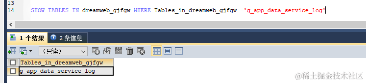 Sql sql = new Sql("SHOW TABLES IN dreamweb_gjfgw WHERE Tables_in_dreamweb_gjfgw ='g_app_data_service_log';");