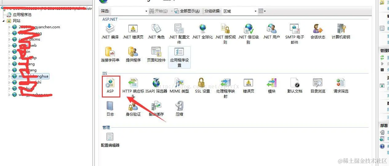 一、打开 Internet 信息服务(IIS)管理器。点击出错的站点,并双击右边的ASP图标,如下图所示: