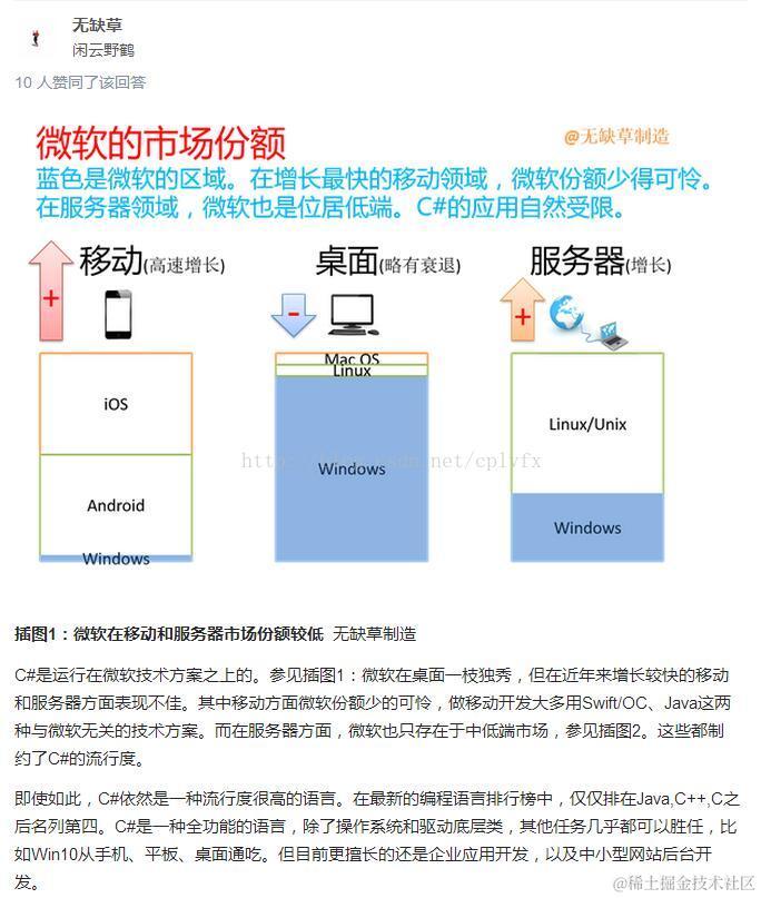 看未来不能以当前的状态看未来,c#的mono已经开源, 随着消费习惯的改变,移动终端市场比电脑终端市场大得多,未来70亿人,有60亿人用移动终端不是夸张,对用户沾性更强,估计再过几十年未来终端应该是平板(大的,包括tv)+手机+手表+vr,这种新型终端,得终端者得天下,而传统pc可能只是生产者工具。
