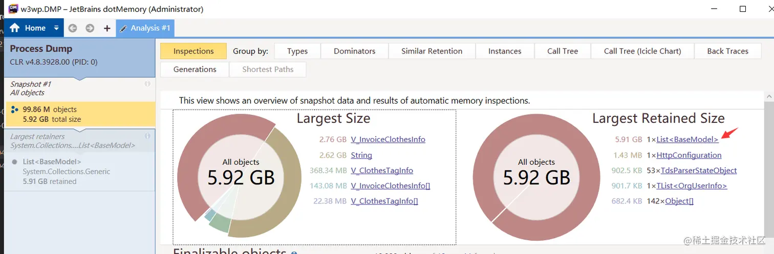 从输出中可以看到,它貌似被一个 List<BaseModel> 所持有,哈哈,总算找到了,接下来就简单了,直接用 !objsize 看一看它的 size 有多大?
