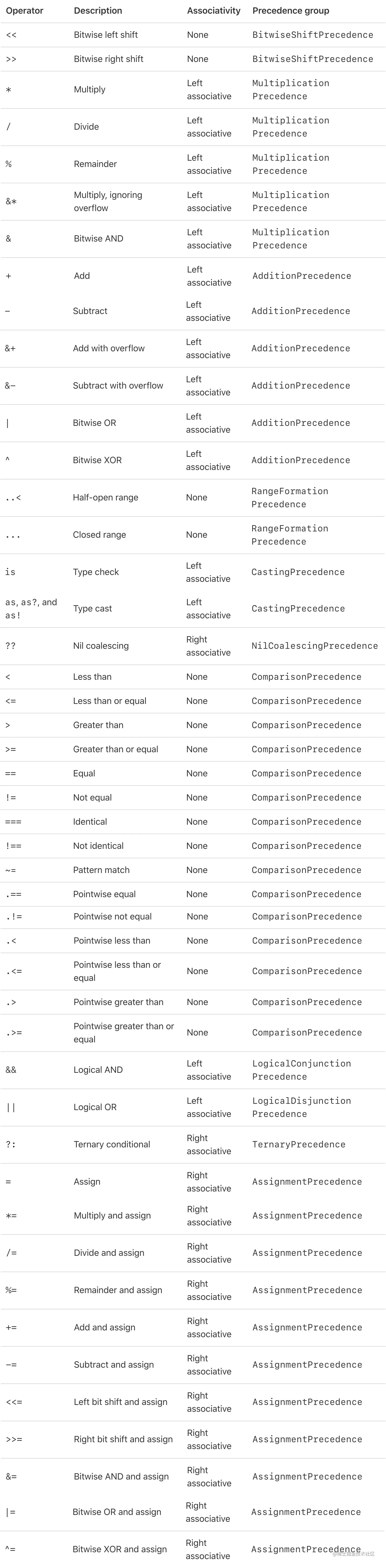 参考官方文档: 1. 运算符优先级组描述:developer.apple.com/documentati…