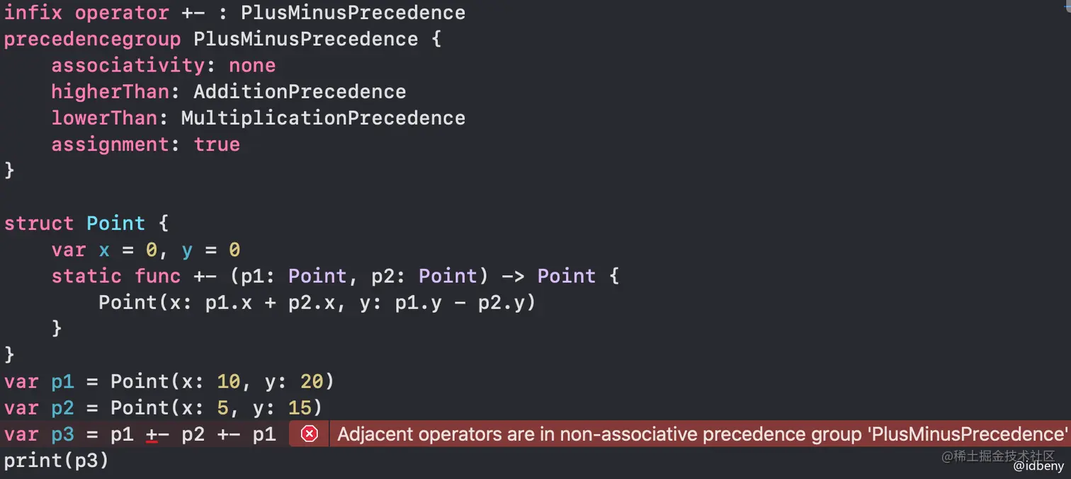 associativity结合性有三个取值:left:从左往右开始结合计算right:从右往左开始结合计算none:仅限一个运算符,多个运算符会报错(例:a1 + a2 + a3,有2个运算符编译报错)