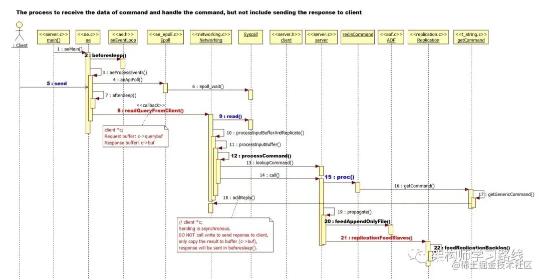 上述三个流程均是异步化的,并且没有直接的联系。它们的共同点均是通过REdis的简单事件驱动(AE,A simple event-driven)触发,对于Linux实际是epoll的包装,对于macOS为evport的包装,对于FreeBSD对kqueue的包装,对于其它则是select的包装。