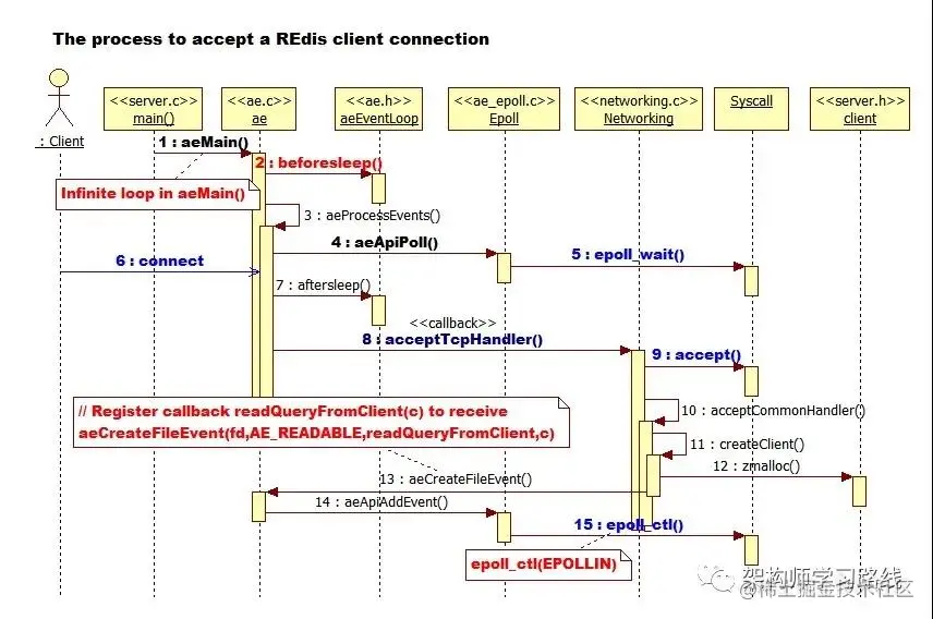 接受一个连接后,为该连接创建一个client对象,并将该client注册到epoll中,注册事件为EPLLIN(对应于ea的AE_READABLE)。