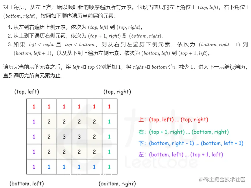 可以将矩阵看成若干层,首先输出最外层的元素,其次输出次外层的元素,直到输出最内层的元素。