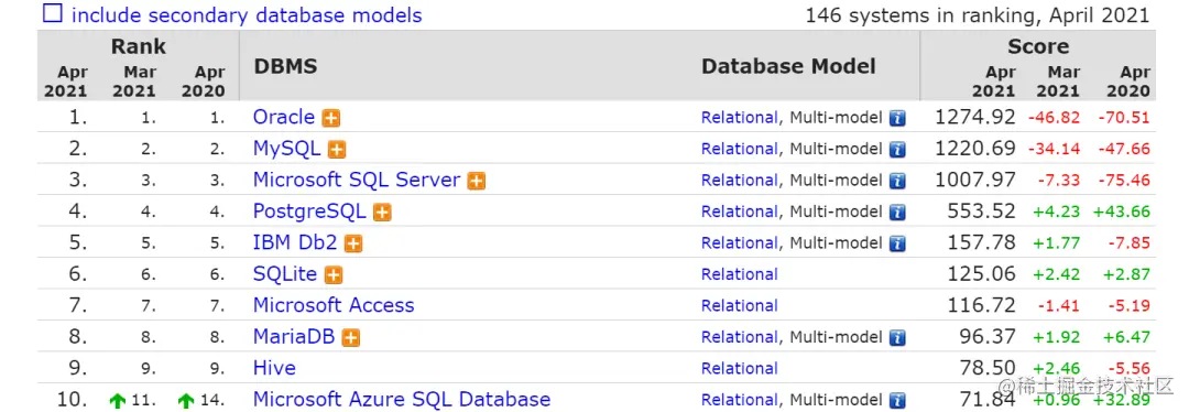 稳居前三的 Oracle、MySQL 和 Microsoft SQL Server 分数出现了较大幅度的下跌,分别减少 46.82、34.14 和 7.33 分。