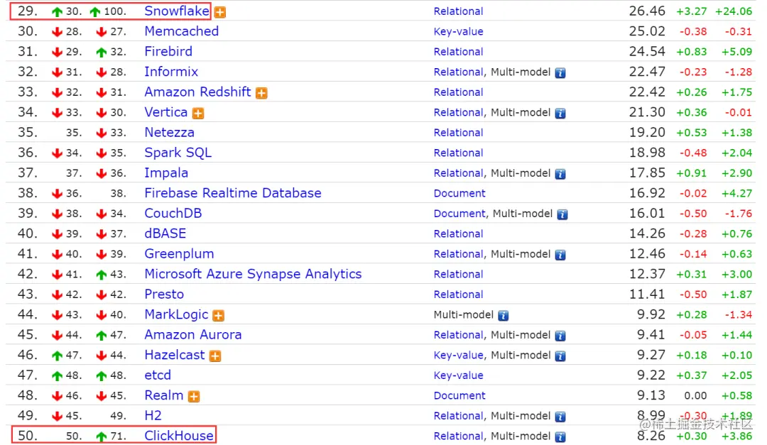 对于排名 20 之后的数据库,以年为维度,排名显著上升的数据库有 Snowflake 和 Clickhouse,Snowflake 由去年同时期的第 100 名上升到现在的第 29 名,后者也从第 71 名上升至第 50 名。