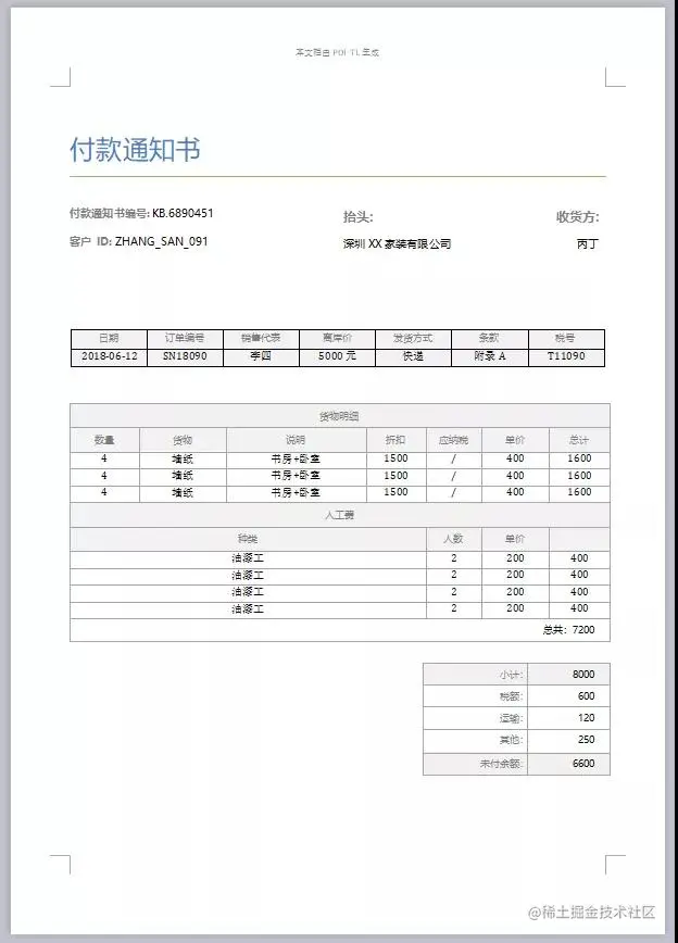 需要生成这样的一份流行的通知书:大部分数据是由表格构成的,需要创建一个订单的表格(图中第一个表格),还需要在一个已有表格中,填充货物明细和人工费数据(图中第二个表格)。
