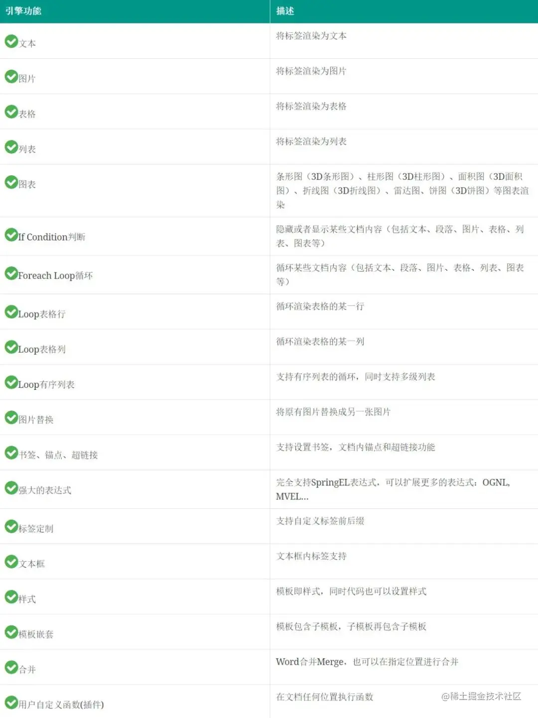 Apache POI不仅封装了易用的文档API(文本、图片、表格、页眉、页脚、图表等),也可以在底层直接操作文档XML结构,poi-tl正是一个基于Apache POI的Word模板引擎,通过下表的对比,相信你不难知道为何要选择poi-tl: