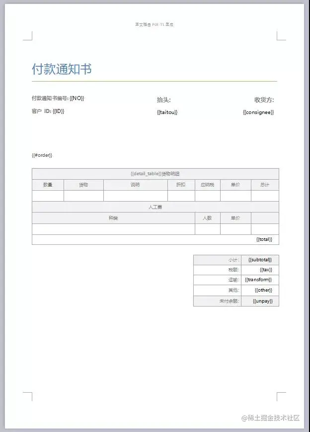 使用{{#order}}生成poi-tl提供的默认样式的表格,设置{{detail_table}}为自定义模板渲染策略(继承抽象表格策略DynamicTableRenderPolicy),自定义已有表格中部分单元格的渲染。