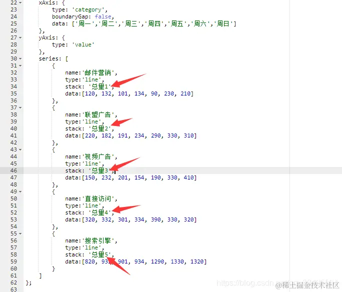 两个折线,第二个折线数据是0,在图上显示却和第一条折线类似,很明显这不是我想要的,最后查证发现需要把series中的stack属性去掉或者设置不同的值,如图