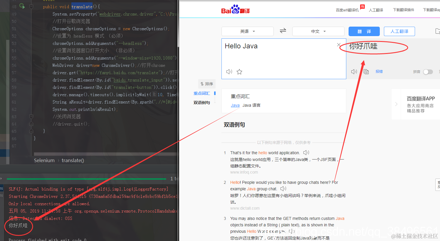 String aResult=driver.findElement(By.xpath(".//*[@id=\"main-outer\"]/div/div/div[1]/div[2]/div[1]/div[2]/div/div/div[1]/p[2]/span")).getText();//取翻译结果