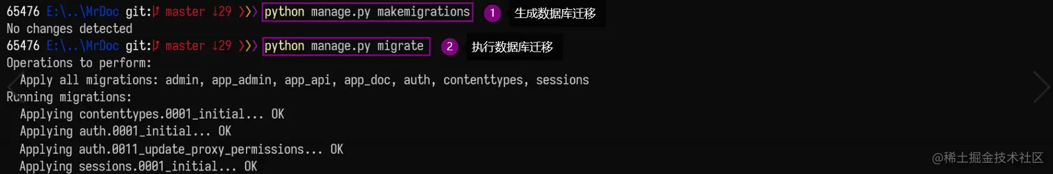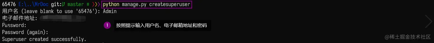 4、进入 MrDoc 文件夹,重复简单测试的 3、4、5 步骤,分别实现依赖库的安装、初始化数据库以及创建管理员账号(略)。