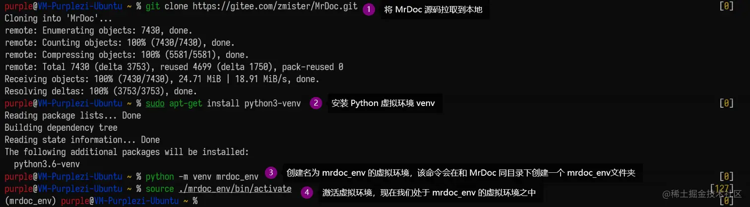 3、将 MrDoc 的源码拉取至本地(用之前的命令),但是为了不对服务器上现存的环境造成影响,我们这次需要用到虚拟环境: