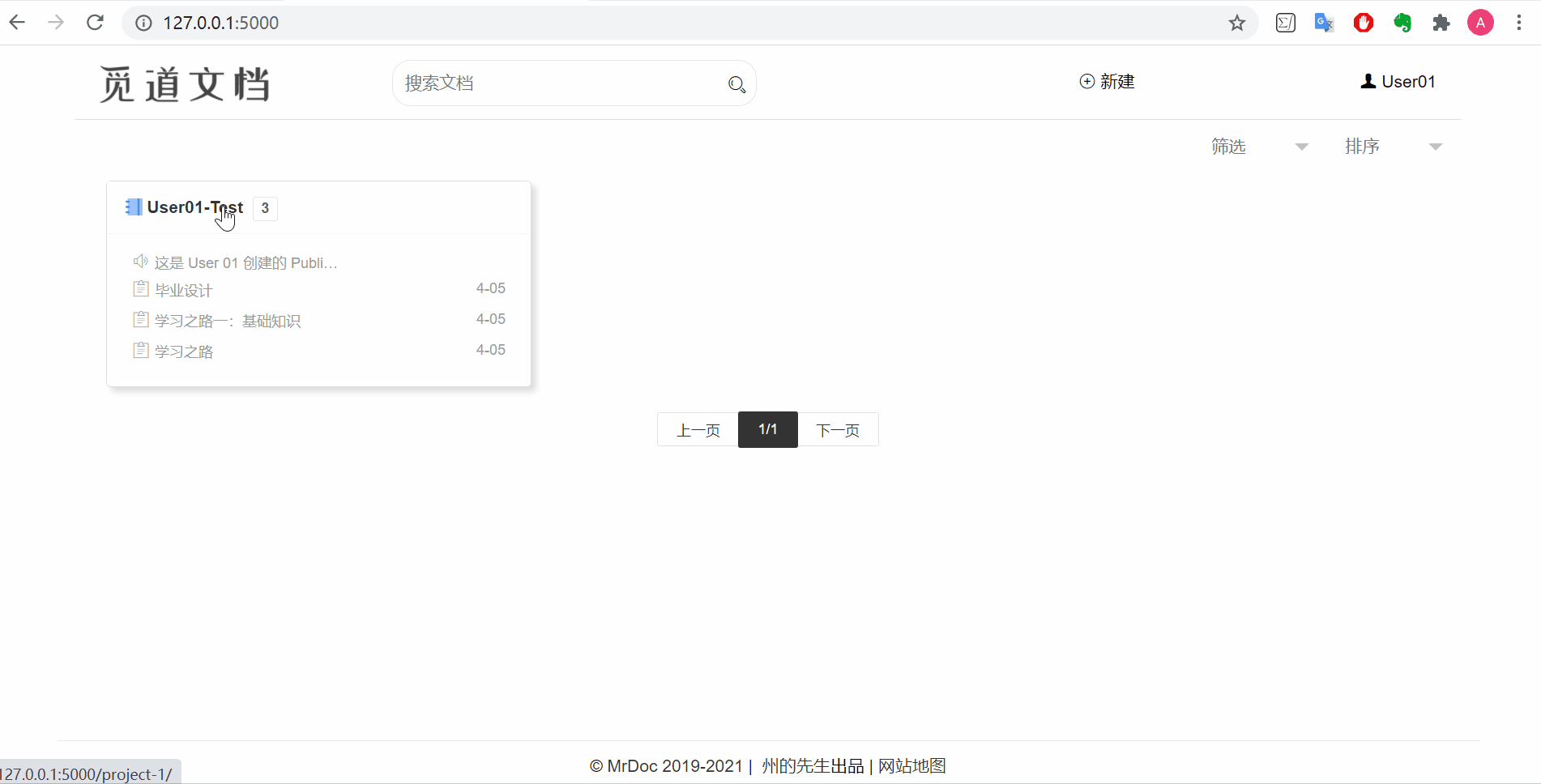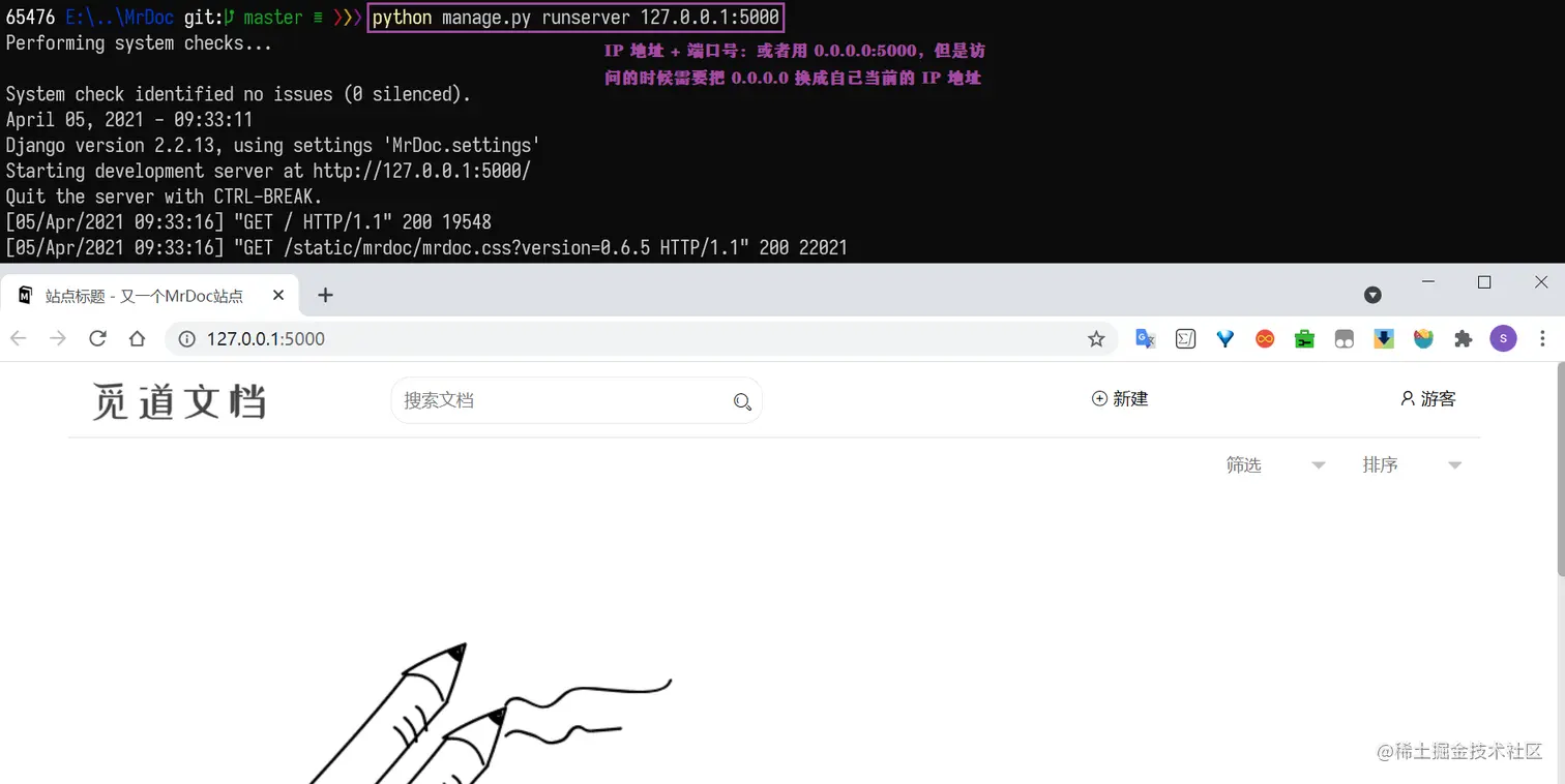 6、本地上线测试:在测试环境中,可以使用 Django 自带的服务器运行 MrDoc。