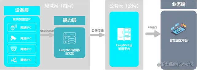 针对该需求,我们建议使用“EasyNVR+EasyNVS”结合的解决方案。EasyNVR下沉到终端网络,置于用户内网现场,对接内网摄像机、NVR网络硬盘录像机等设备,与云端的EasyNVS云管理平台对接,由EasyNVS进行统一能力输出。