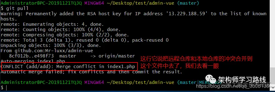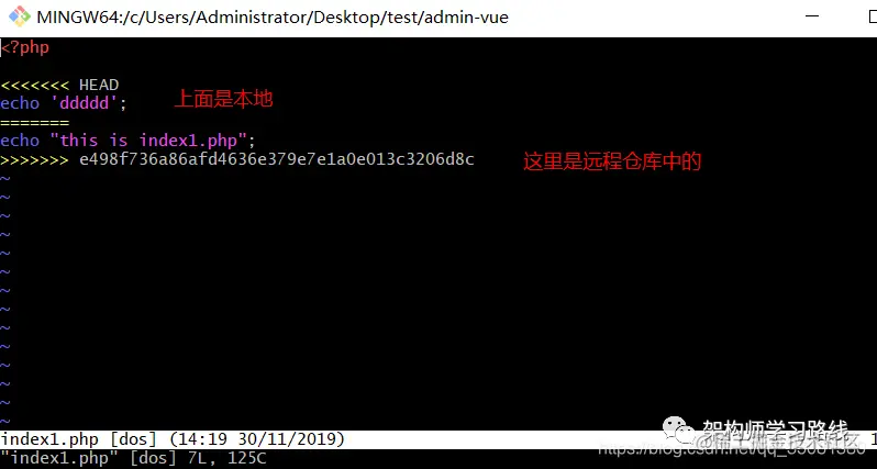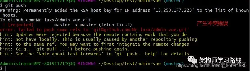 Git的版本冲突怎么解决? 编程学习网 2021-04-30 609 阅读1分钟 产生原因:因为你提交的时候你本地的代码不是最新版本,所以git不知道以那个版本为标准,为了防止代码覆盖,git不允许你的提交 解决: 从错误信息中可以看出,第一步,让你git pull vim编辑器打开冲突文件(这里我是用习惯了vim) 把你想保留的留下,然后保存退出 然后提交步骤再来一次即可 git add. git commit -m "冲突解决" git push