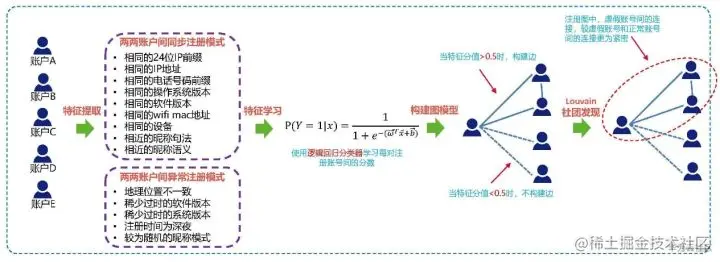 (2)为解决账号间关联强弱的问题,可通过机器学习方法学习自动对不同特征加权的同步异常特征评分,并根据评分判断是否在账号间构建带权重的连边。