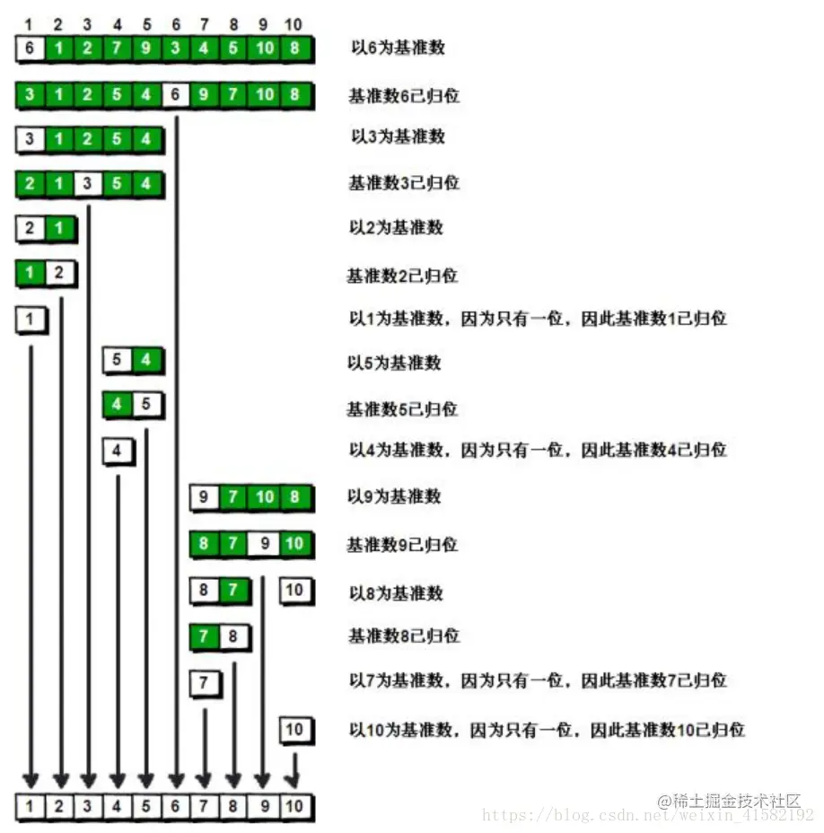 当我们面对一个要排序的数组时,我们首先要找一个基准数(这个基准数没有特殊限定,一般去数组第一个数),然后我们想办法将数组中大于这个基准数的数据放在基准数的一端,小于基准数的数据放在另一端。现在我们就得到了两个子数组,虽然这两个子数组并不是排序完成的,但我们能确定,其中一个子数组内所有的数都小于另一个,也就是说,当我们将这两个子数组排序完成时,整个数组自然就有序了。那么现在就是使用分治思想的地方,分开这两个数组后,再利用上述思想,同样找基准数,将数据按基准数分开两边,这时,我们就拥有了四个子数组。以此下去,当我们每个子数组都是有序的,那么我们就排序完成了。通过递归我们可以实现这一步骤。