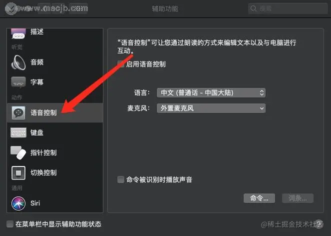如何在Mac上语音控制中启用/禁用命令? 路过mac 2021-04-30 215 阅读1分钟 我们在使用Mac电脑的时候可以启用/禁用语音控制中的任何命令,包括Apple和您自己创建的命令。那我们该如何启用/禁用命令呢?接下来小编给大家分享一下具体的操作方法,需要的朋友欢迎参考操作! 具体方法如下: 1.单击“系统偏好设置”。 2.在系统偏好设置页面,选择辅助功能。 3.在“辅助功能”页面上,点击“语音控制”。 4.单击命令按钮。 5.选中要启用的命令的框,或取消选中要禁用的命令的框,单击完成按钮即可。 以上就是在Mac上的语音控制中启用/禁用命令的方法,希望对您有所帮助。