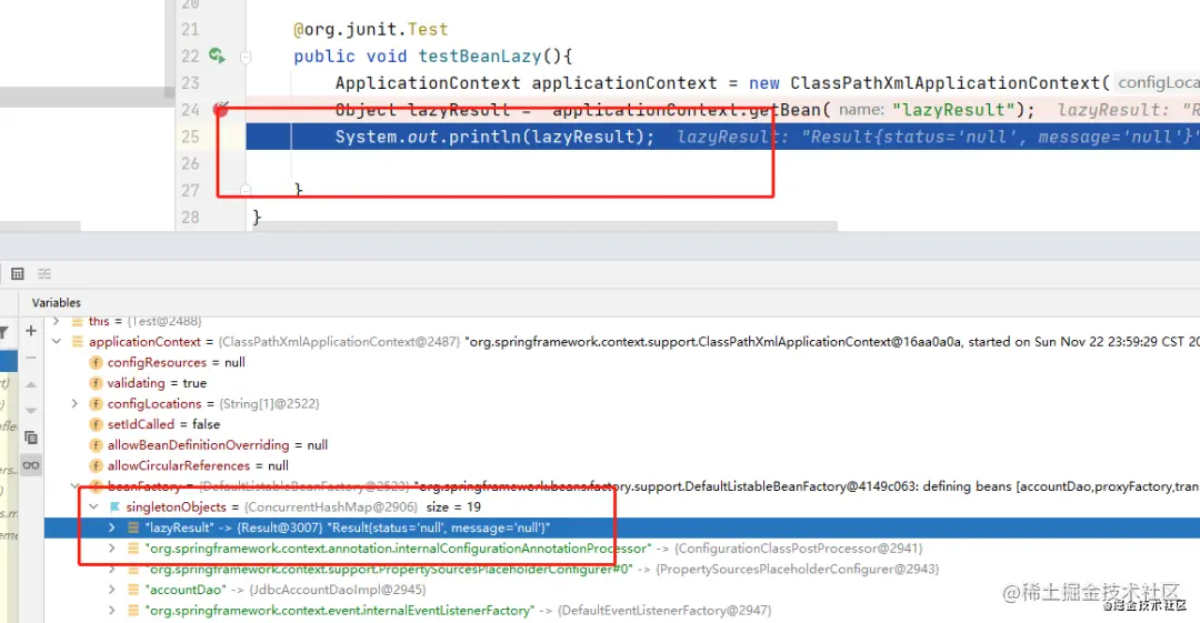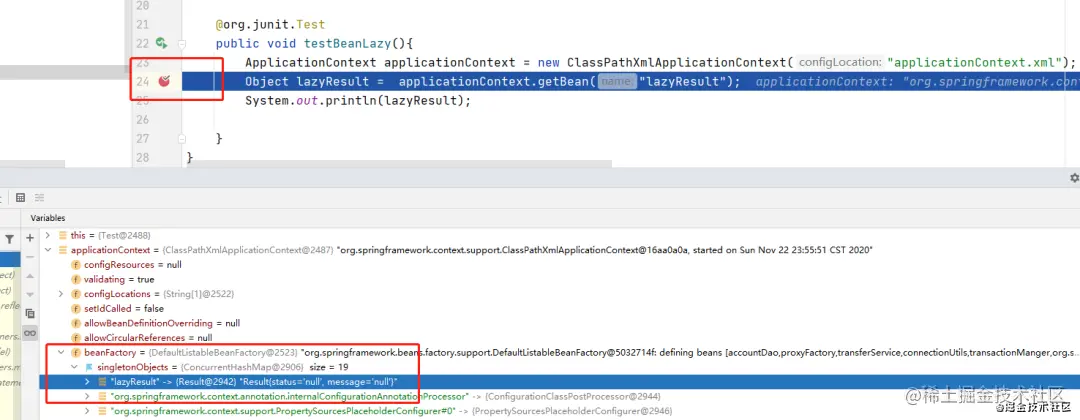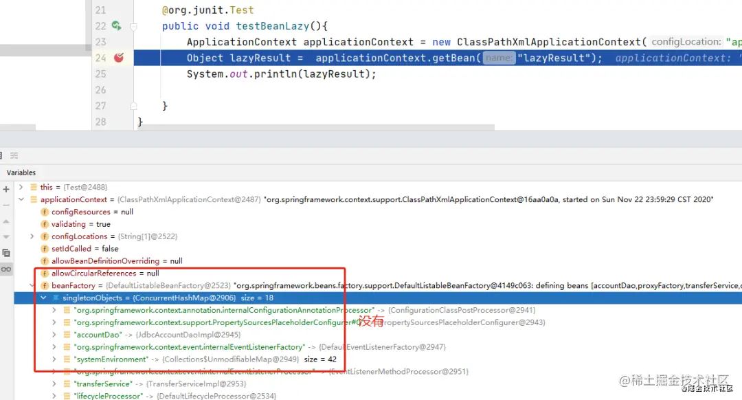 可以看到,在容器启动后,getBean之前,lazyResult这个bean已经存在了。