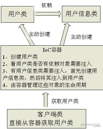 当有了IOC的容器后,在客户端类中不再主动去创建这些对象了,如图所示: