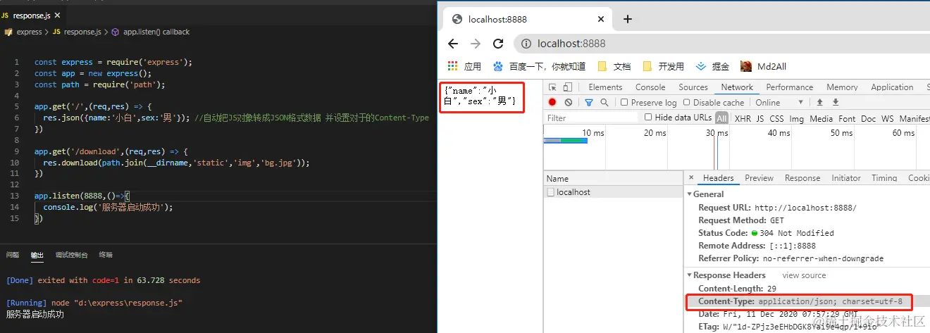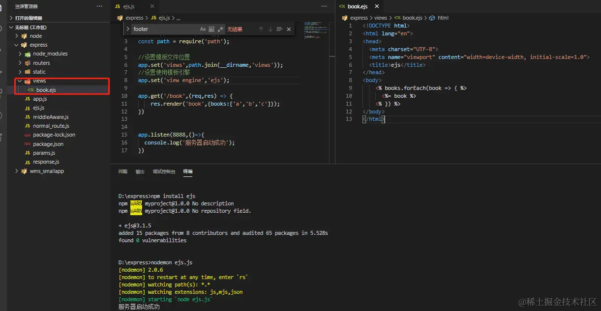 关于express 二拾四 2021-04-30 135 阅读1分钟 安装使用 新建文件 命令行输入npm init -y 创建package.json 命令行输入npm inistall express 创建app.js文件 命令行输入nodemon app.js运行服务 路由 基本处理 2.模块处理 中间件 模拟中间件 2.使用第三方中间件/express内置中间件 express-响应 express获取请求参数 express-ejs模板引擎 动态路由