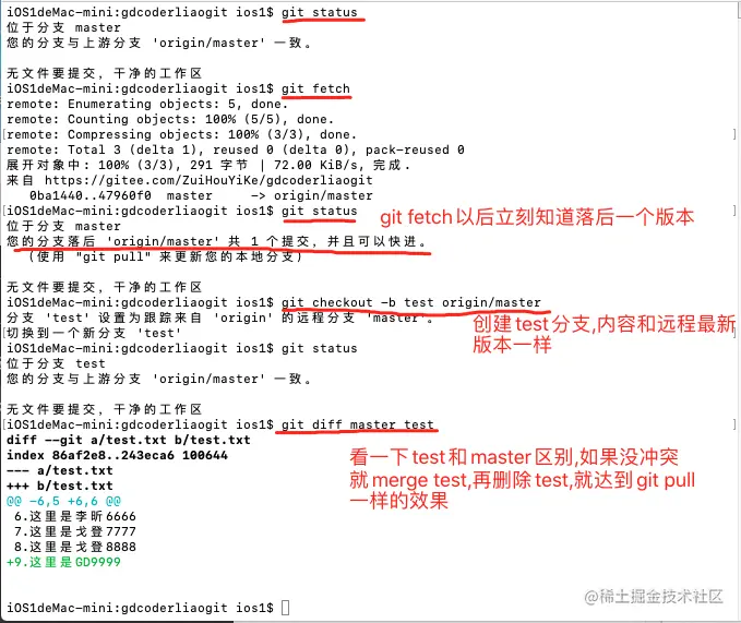 所以,如果我们git fetch之后发现我们确实是落后了版本,这时候我们就可以创建一个新的$ git checkout -b test origin/master(假设是test分支),这个时候我们切换到test分支就是和远程代码一摸一样,而切换到master分支就是我们之前的代码,这样我们就可以使用git diff master test比较分支差异,再合并即可.直接演示操作如下: