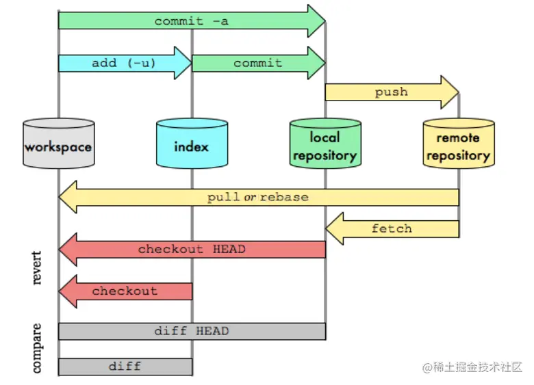 Git本地有三个工作区域:工作目录(Working Directory)、暂存区(Stage/Index)、资源库(Repository或Git Directory)。如果在加上远程的git仓库(Remote Directory)就可以分为四个工作区域。
