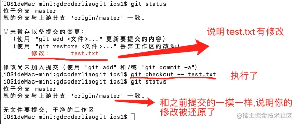 9.git checkout -- test.txt :让test.txt回到最近一次git commit或git add时的状态。