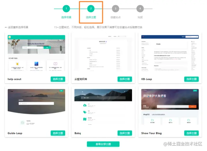 第二步:选择模板。选择适合的页面主题模板,官网提供了十多个免费的主题模板,后面可以根据需要在设置进行更换。