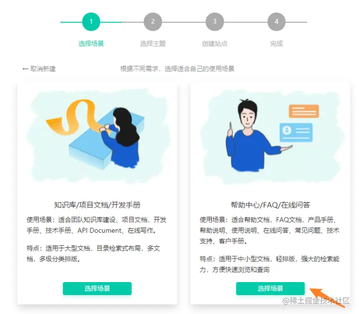 第一步:进入Baklib,建立站点。注册登录之后,新建站点,根据目前的需求,选择制作帮助中心的场景。