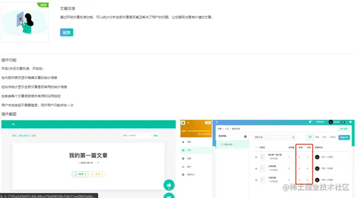 第四步:数据分析。在侧边栏“插件”中找到“文章反馈”。通过网站的月度数据能够直接知道内容是否对用户有用,并根据用户的搜索关键词更新调整内容,帮助帮助中心做的更好。