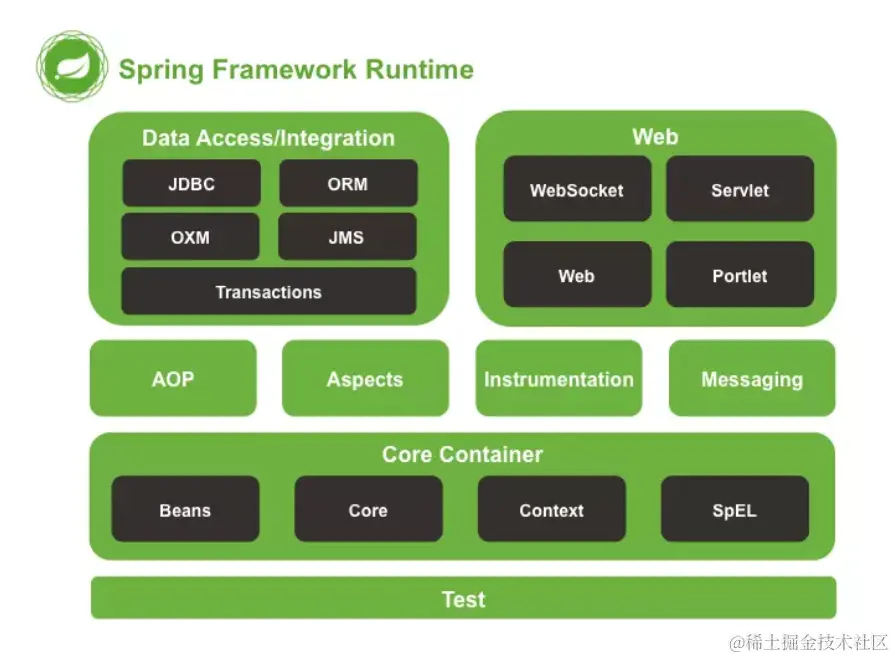 - spring test:主要为测试提供支持的,支持使用JUnit或TestNG对Spring组件进行单元测试和集成测试。