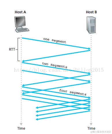 当一个TCP连接开始时,CongWin的值为一个MSS,初始发送速率约为MSS/RTT。如果采用线性增加,那么发送速率增大到一个可观的值可能需要很长时间,所有TCP采用指数增长的方式,每过一个RTT将CongWin增大一倍,直到发生丢包CongWin减半,然后开始线性增长。