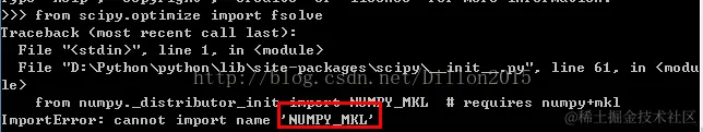 在调用scipy时出错,信息如上。原因是scipy依赖numpy和MKL ,通过pip安装的numpy缺少MKL