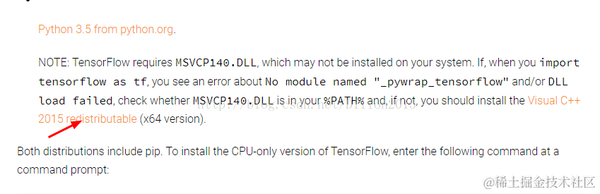 在windows上运行tensorflow需要WSVCP140.DLL 根据提示去下载安装Visual C++2015 redistributable