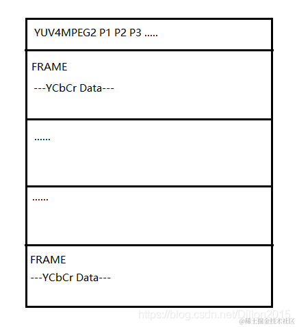 YUV4MPEG2格式是一种未压缩的视频文件格式,由文件头和各个帧的数据组成,每帧数据是YCbCr420,YCbCr422或YCbCr444格式。下图是y4m格式文件的结构。