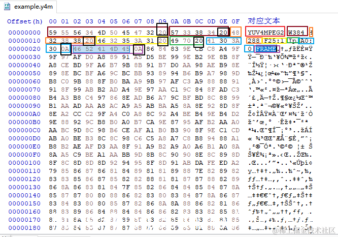 文件头: 文件头是以明文形式存储的,前10个字节为固定的"YUV4MPEG2 "第十个字节为空格(ASCII 0x20)。紧接着是各个参数,以空格分割(ASCII 0x20)。然后文件头尾部是一个换行(ASCII 0x0A)。