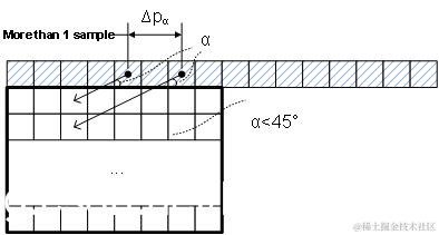 如上图所示,在对矩形块进行WAIP预测时,垂直相邻的两个像素可能使用不相邻的参考像素,为了减少参考像素间距过大的影响,需要对参考像素进行低通滤波和平滑处理。当预测模式是[-14, -12, -10, -6, 72, 76, 78, 80]时,参考像素可以不经处理直接使用。