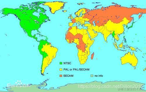 NTSC、PAL和SECAM是世界上最主要的三大电视制式,并且这三种制式间不能兼容,例如PAL的视频不能在NTSC制式的电视上播放。下图是三种制式在世界上的使用分布图。