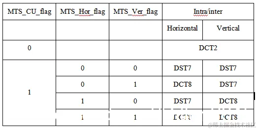 如果CU的MTS标志位为0,则在水平和垂直方向上都应用DCT2变换。如果CU的MTS标志位为1,则需要再设置两个标志位表示水平和垂直变换类型。具体类型如下:
