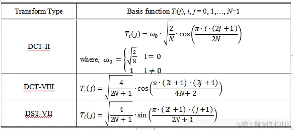 在数学上共有8种类型的DCT变换,在HEVC变换编码中只使用了DCT-II变换。在VVC中提出了MTS技术,可以使用更多类型的变换。可选的变换核如下: