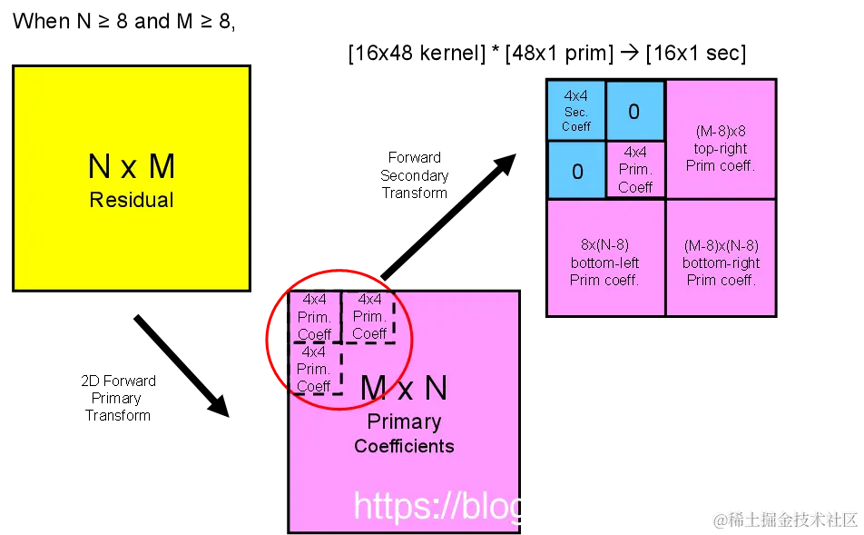 二次变换:就是在主变换(Primary transform)之后对频域信号进行第二次变换,将信号从一个变换域转换至另外一个变换域,之后再进行量化,熵编码等操作,其目的是进一步去除统计冗余。