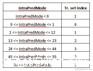 使用哪个变换集由其所使用的帧内预测模式决定,帧内预测模式和变换集对应关系如下: