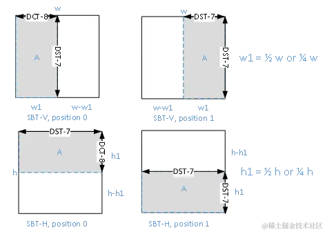 当一个帧间预测CU使用SBT模式时,需要在码流中传输SBT类型和SBT的位置信息。如下图所示,SBT有两种类型和两种位置。