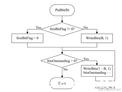 PutBit(B)用来输出编码符号0或1,从重归一化可以看出: