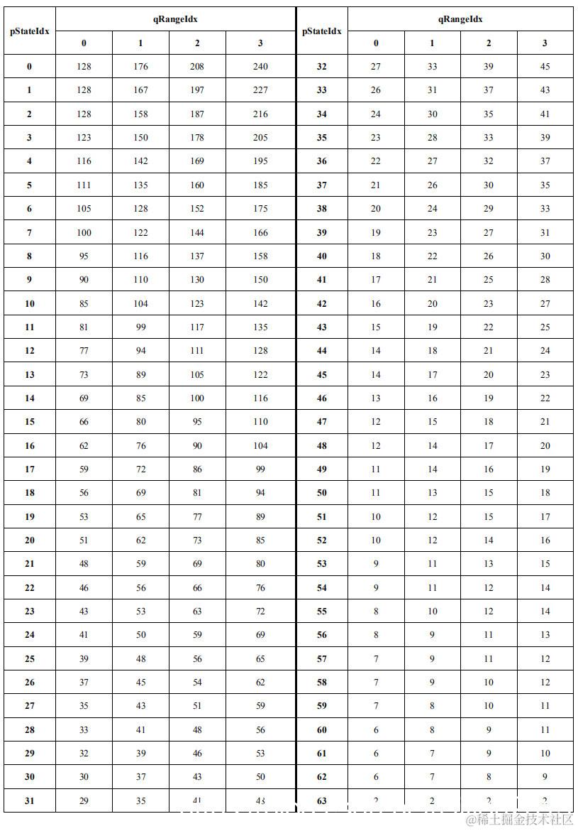 通过查下表LPS对应的子区间长度为:ivlLpsRange = rangeTabLps[pStateIdx] [qRangeIdx]